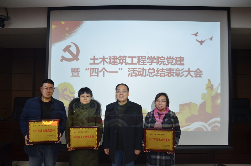 首先,院党委副书记、副院长赵钦宣读了学院开展“四个一”活动以来,先进支部和个人的《表彰决定》。“四个一”暨“一名教师一个楷模、一个党员一面旗帜、一名干部一个标杆、一个支部一座堡垒”。在全年的活动中,各支部积极组织,全院教工积极参与,经学院党委对各支部年底工作的汇报考核,最终决定授予工程管理系党支部、工程力学系党支部、土木工程系党支部“先进党支部”荣誉称号,姜仁贵等6名同志“优秀共产党员”荣誉称号,王砚等6名同志“先进党务工作者”荣誉称号,潘秀珍等5名同志“师德先进个人”荣誉称号。学院班子成员、院工会主席等为获得表彰荣誉的支部和个人颁发奖牌和荣誉证书。