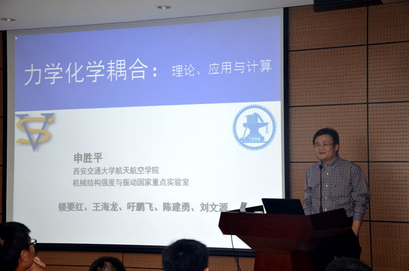 开幕式结束后,国家杰出青年科学基金获得者、西安交通大学航天航空学院院长申胜平教授作了题为《固体化学力学:理论、应用与计算》的学术报告。申教授从工程应用背景和国外研究现状等方面讲述了力学化学耦合研究的必要性,阐述了力学化学耦合的基本思想和研究特征,介绍了力热电化学耦合变分原理,完全耦合的控制方程、边界条件以及含移动界面的界面条件,材料高温氧化过程中的应力分析模型,以及构建的力学化学耦合问题数值计算方法等研究成果。报告结束后,申胜平教授还与老师、同学们进行了互动交流,对提出的问题作了详细耐心的讲解。