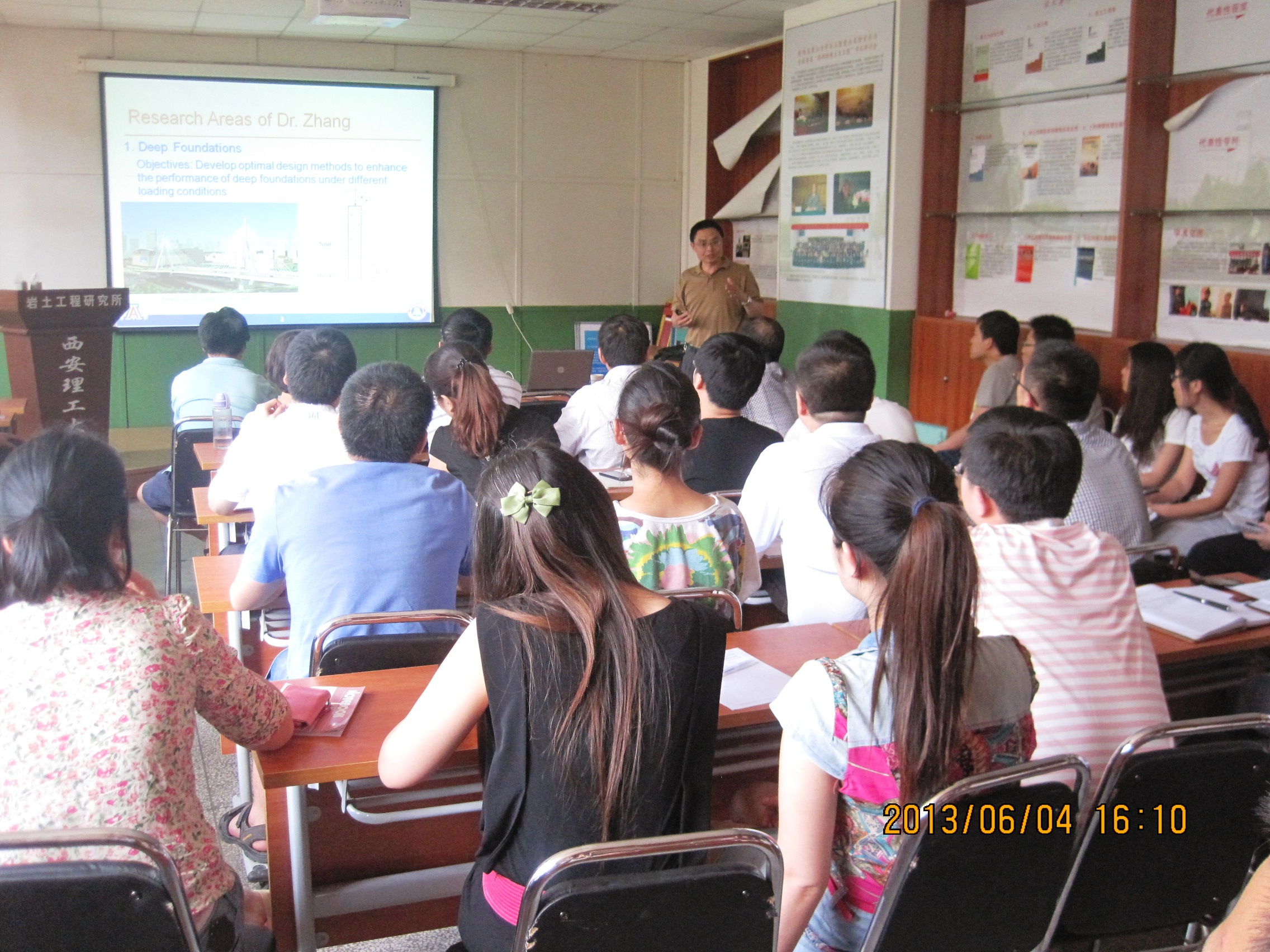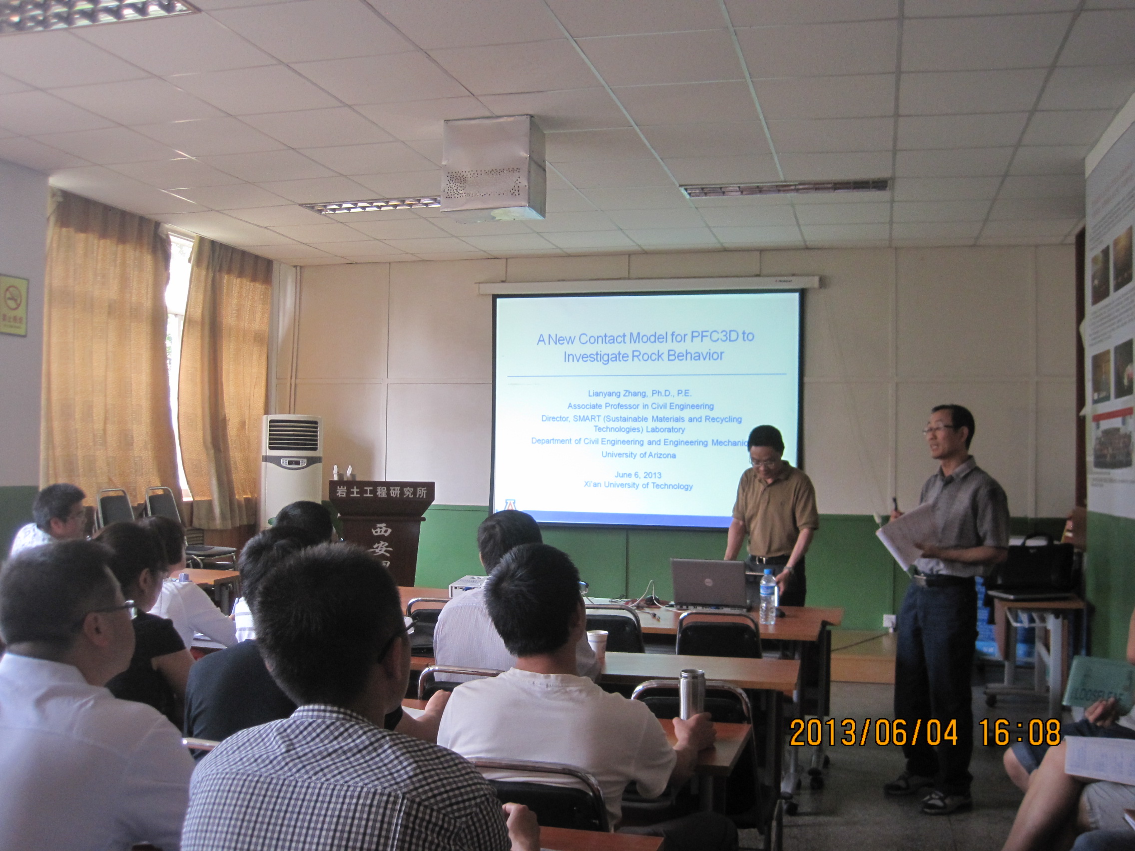 2013年6月6日,张连洋副教授在西安理工大学岩土工程研究所会议室做了题为“A New Contact Model for PFC3D to Investigate Rock Behavior”的学术报告,来自中煤科工集团西安研究院、西安科技大学、长安大学、西安建筑科技大学以及西安理工大学相近专业的专家、教师、研究生约60多人参加了学术报告。