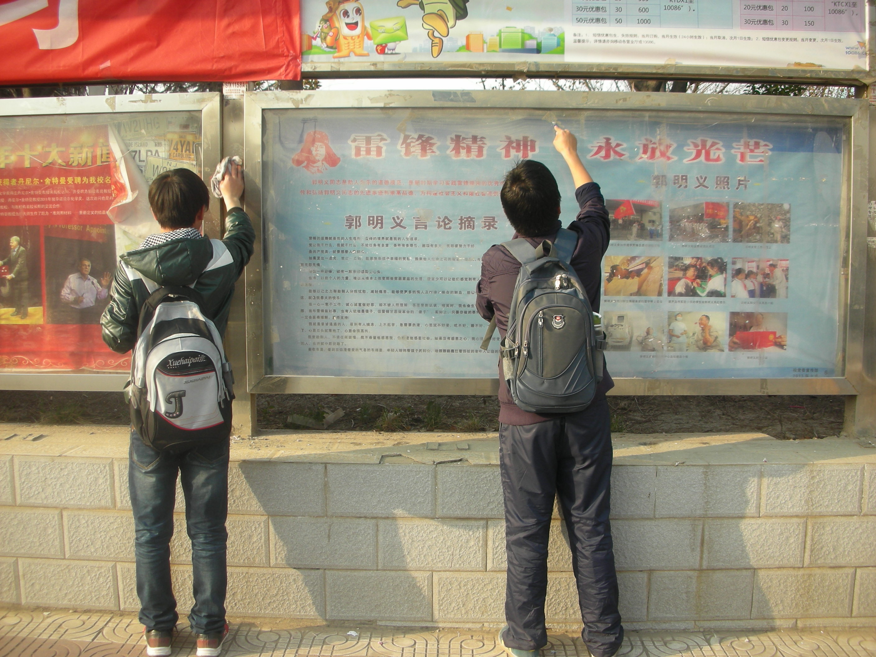 3月5日,正是毛泽东同志题词“向雷锋同志学习”五十周年的纪念日,为进一步学习和弘扬雷锋精神,我院团委组织志愿者积极开展学雷锋活动月系列活动,从身边的小事做起,奉行“我奉献、我快乐”的宗旨,集中清理校园小广告、打扫垃圾等净化校园行动,鼓励大家以实际行动发扬雷锋精神,让雷锋精神吹遍校园的每一个角落。