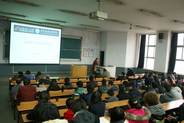 范留明副院长结合我院的专业培养目标和特点,向我院2012届学生详细介绍了毕业设计(论文)工作计划和实施方案,并指出毕业设计(论文)是培养学生独立运用所学知识分析和解决实际问题的重要载体,是人才培养方案中的重要实践教学环节,向2012届学生提出了希望和要求。随后李红英副书记从学生管理视角强调了毕业设计期间的纪律和相关要求,并对下一阶段的毕业生就业工作做了介绍。最后,师俊平书记作总结讲话,强调毕业设计是本科大学阶段最后的学习任务,希望2012届全体毕业生能够独立诚信的完成毕业设计任务,珍惜大学时光,为自己的大学生活画上完满的句号。