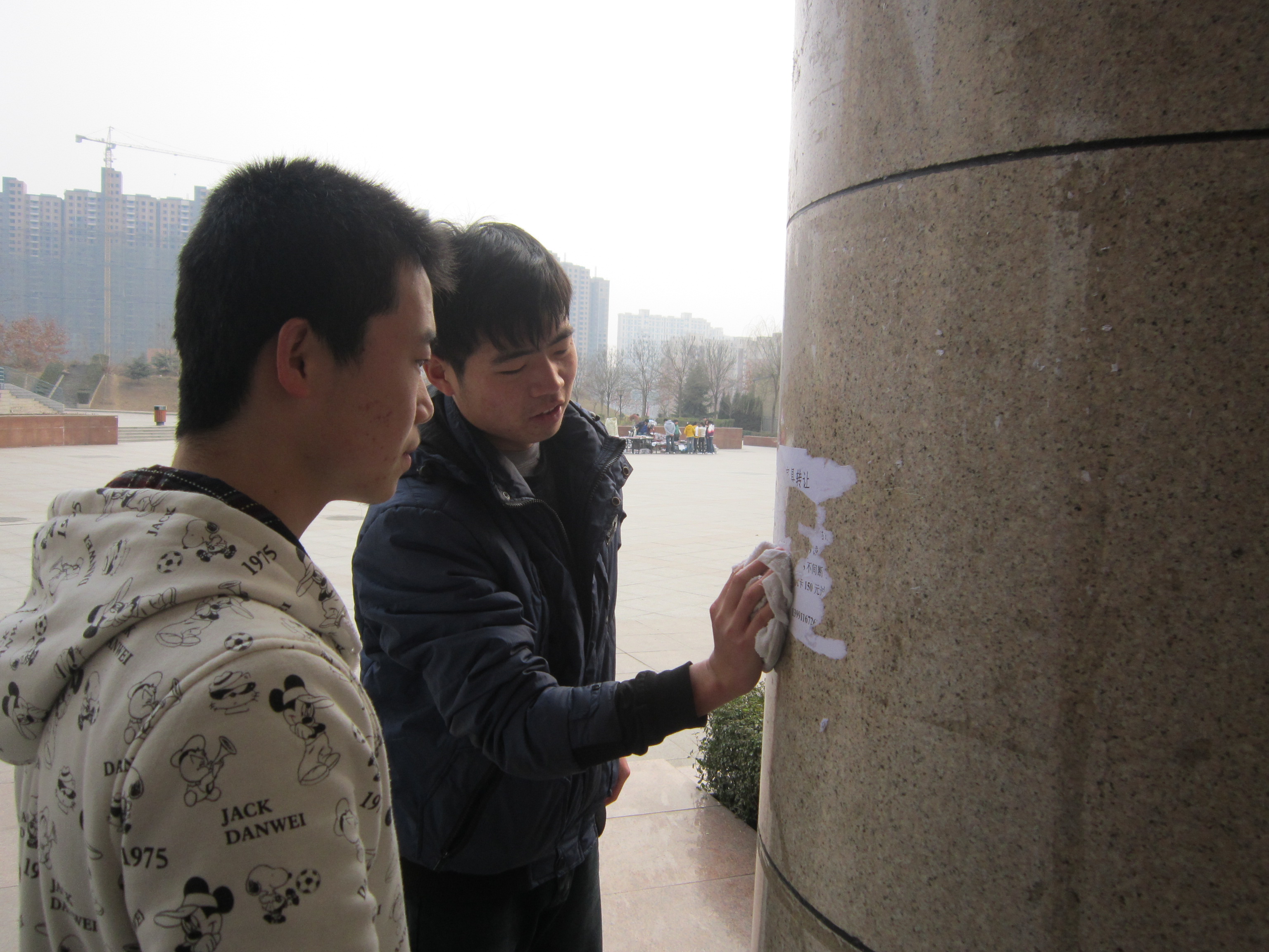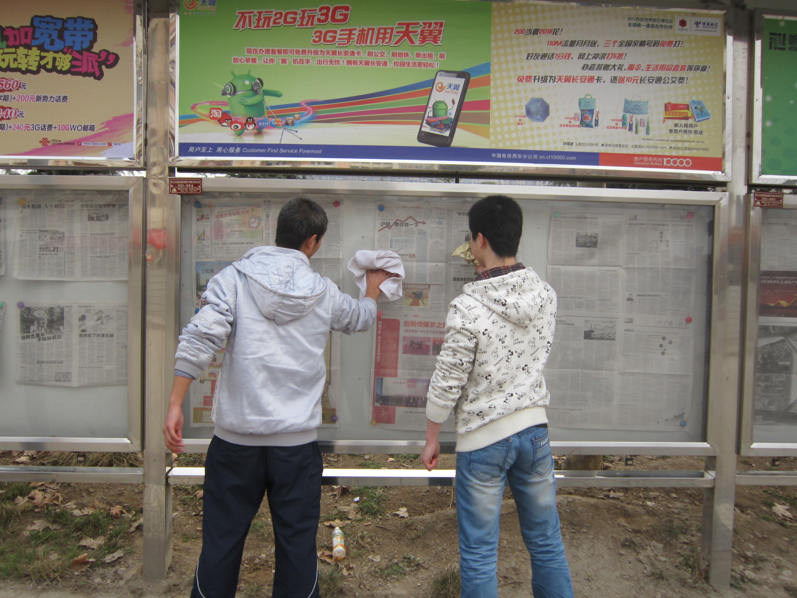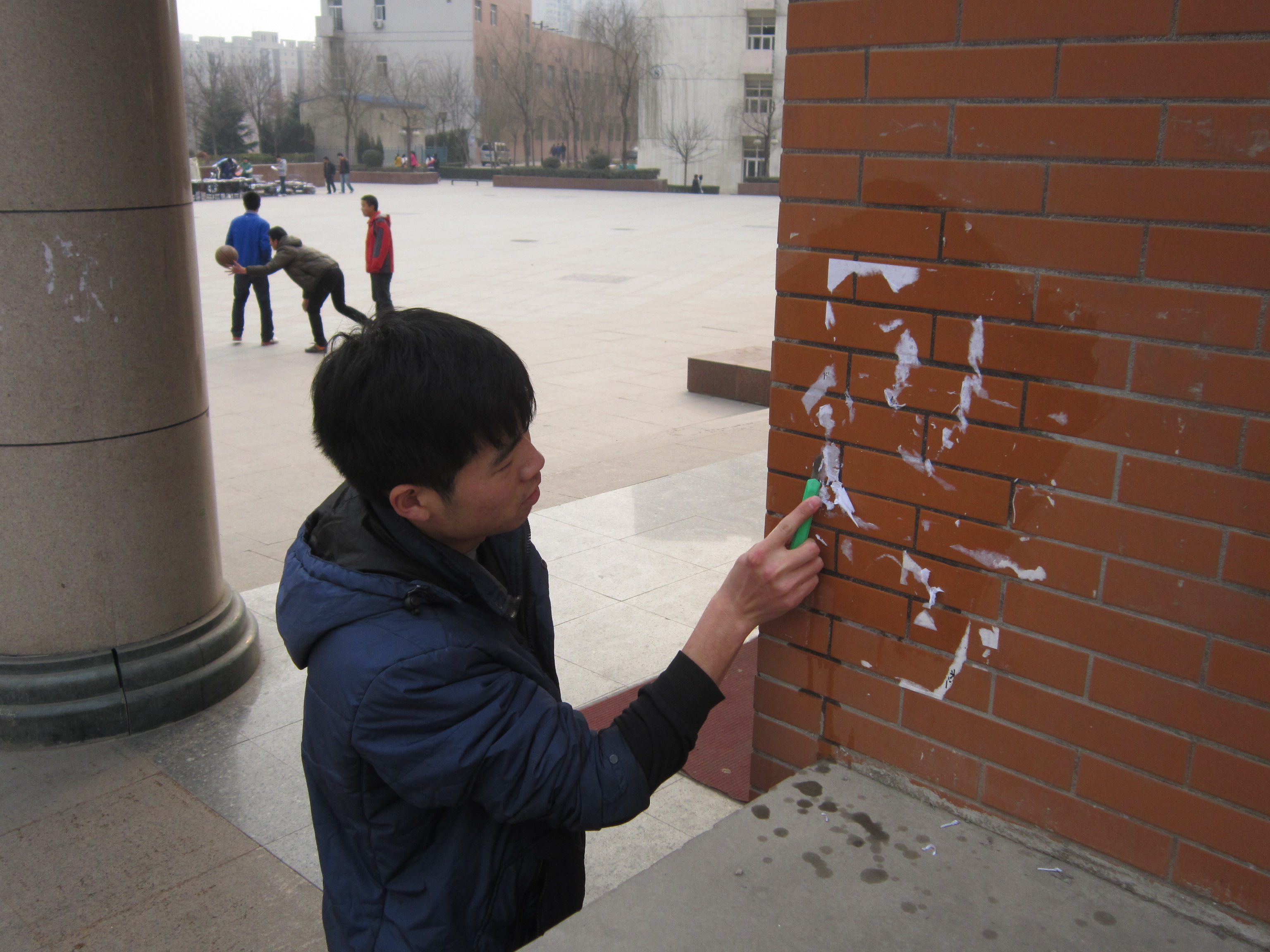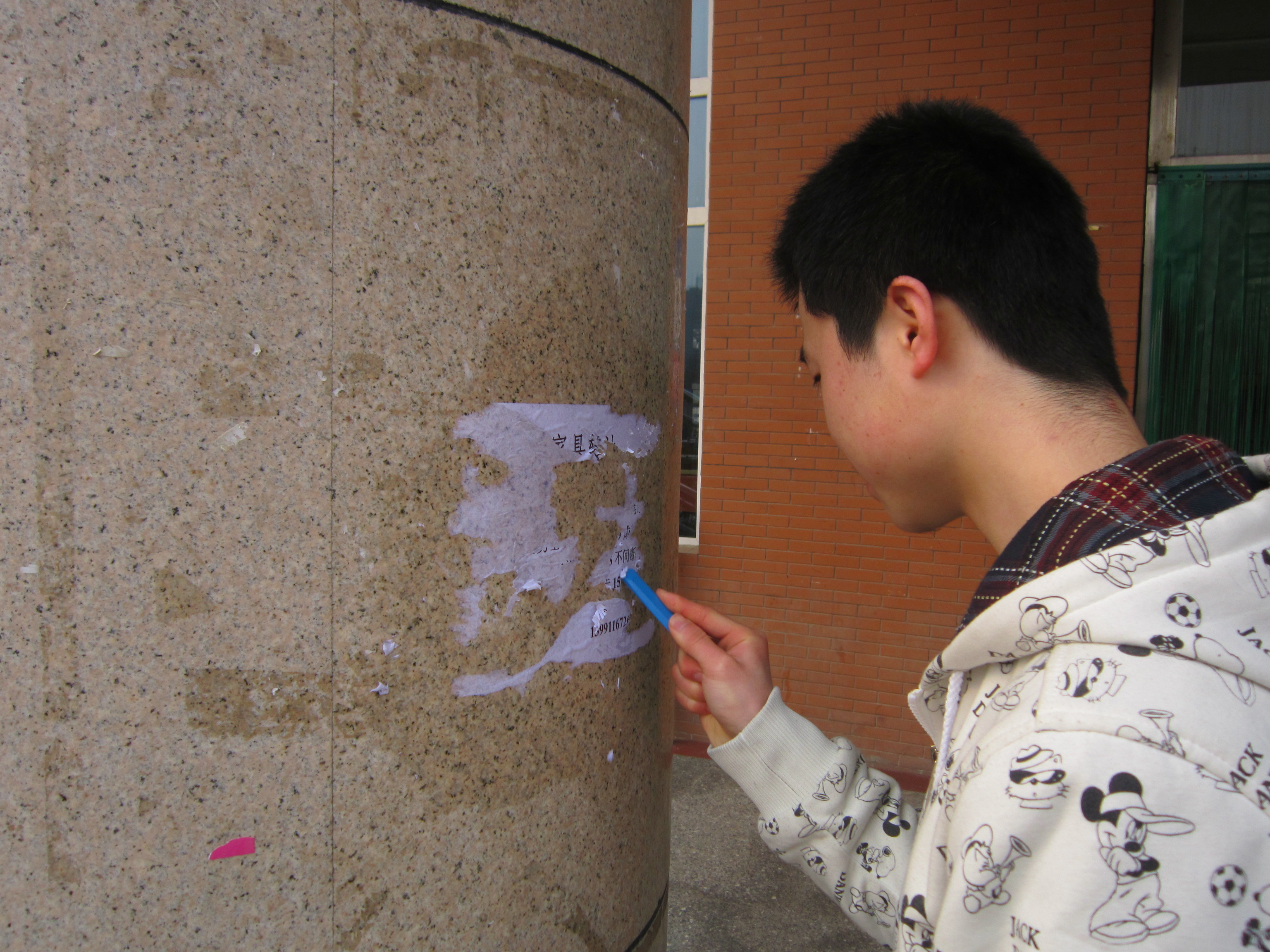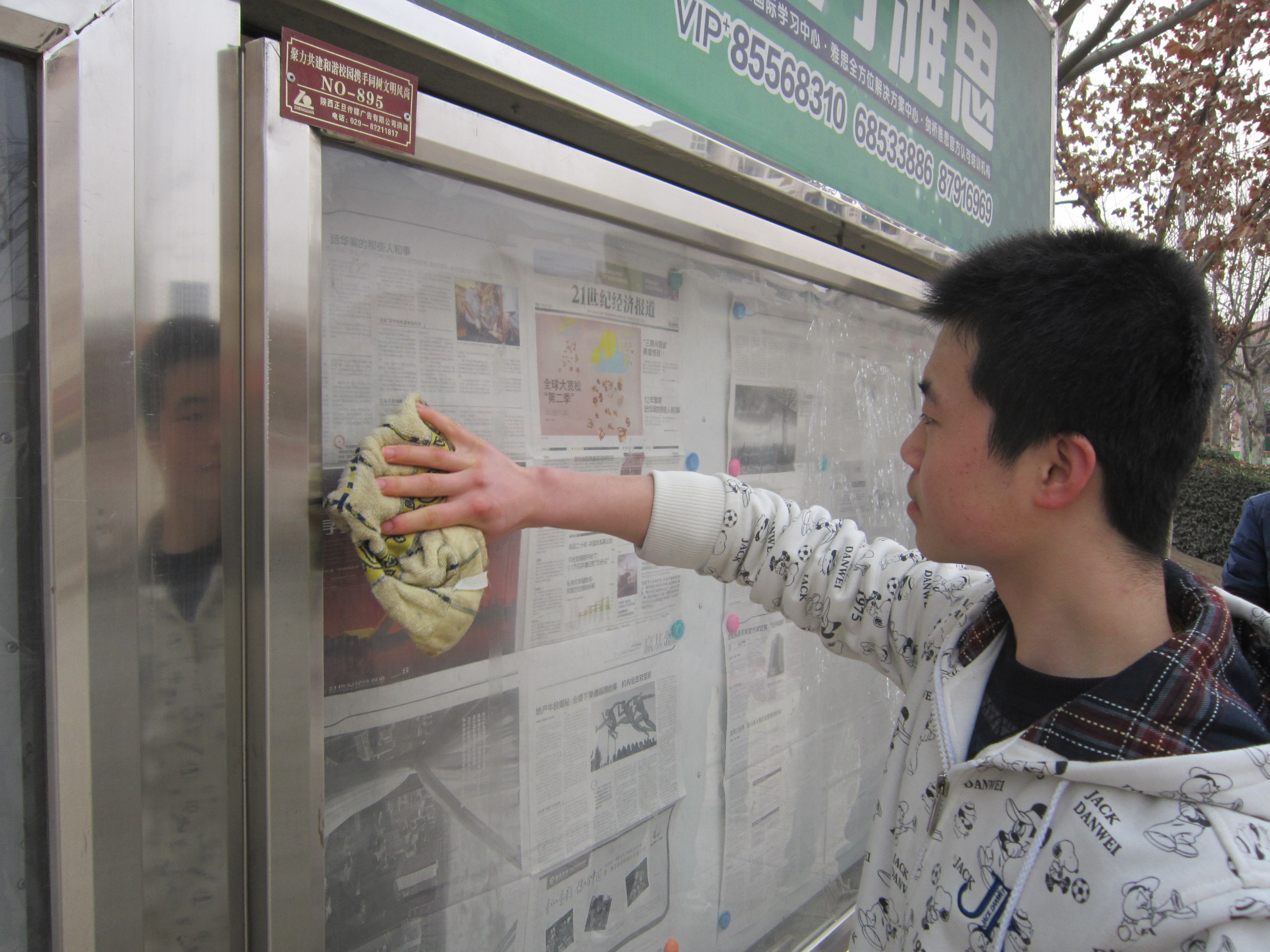 秉着“世界上最光荣的事----劳动;世界上最体面的人----劳动者”的雷锋精神,我院 “学雷锋”志愿者们到曲江校区主干道,为主干道上的橱窗做清洁工作,并清洗校园内张贴的小广告。在这个还有些微寒的日子,他们任劳任怨、勤勤恳恳、认认真真的檫洗着橱窗,想尽各种方法清除小广告。他们不在乎那已冻得微红的双手,也要为校园带来一片整洁,身体力行地践行着“雷锋精神”。