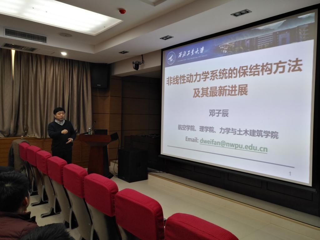 2018年11月28日下午,应bat365中文官方网站邀请,长江学者、西北工业大学教授邓子辰在我校金花校区1号学科楼学术报告厅为我校师生作了题为“非线性动力学系统的保结构方法及其应用”的学术报告。我校力学、土木和机械专业的教师和学生参加了本次报告会。