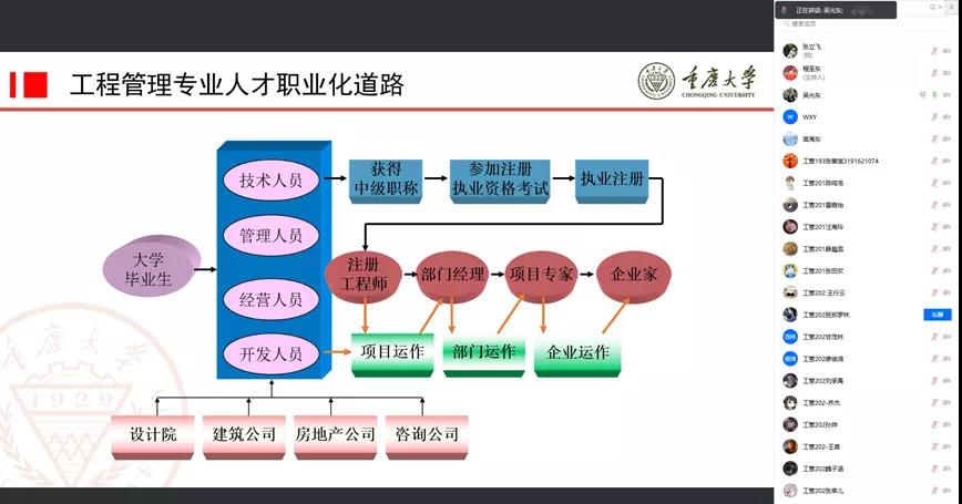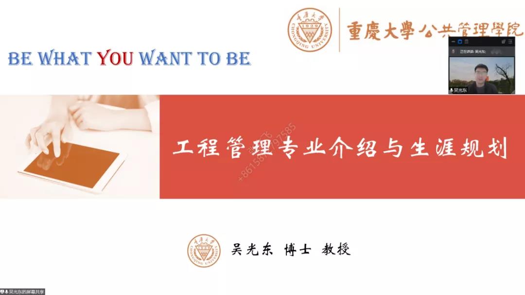 在全校师生同心抗疫、共克时艰的非常时期,1月12日上午,bat365中文官方网站工程管理专业2006届优秀校友、重庆大学公共管理学院博士生导师、重庆市本科一流专业(城市管理)负责人吴光东教授,应邀线上为我校工程管理专业本科生和研究生作了题为“工程管理专业介绍与生涯规划”专题报告。工程管理系教工支部书记程圣东主持报告会。