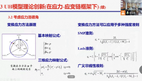 学术报告会上,姚仰平教授以岩土工程的基本问题——土体的变形塑性有限元分析为背景,创新提出了应力应变链概念,以新的视角分析了从六个应力分量到六个塑性应变分量的计算全过程,并揭示了在应力-应变链的各个计算环节中对土的屈服特性、硬化规律、硬化参量、塑性流动方向等的合理刻画会直接影响塑性应变的计算合理性和正确性。以塑性体应变计算为核心,从“算的准”和“分的好”两个层面为UH模型中塑性应变的精准计算提供了理论基础和方法。进一步展示了UH模型相关理论在高土石坝变形分析、承德机场和北京大兴国际机场的变形监测预警和机场锅盖效应的灾害防治分析等方面的工程应用案例。