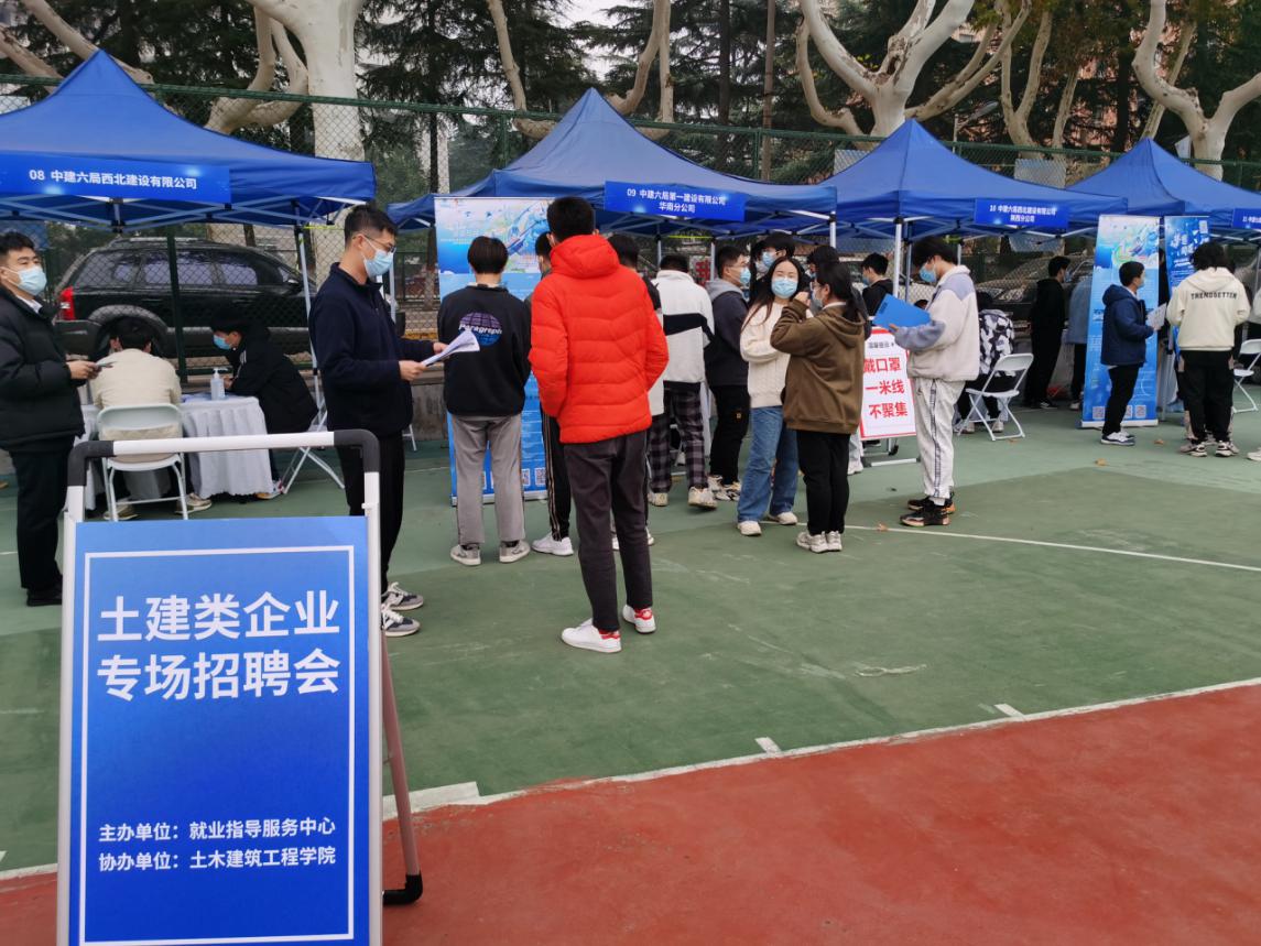 为深入学习贯彻党的二十大精神,落实党中央、国务院“稳就业”“保就业”决策部署,推动学院毕业生更充分、更高质量就业,11月16日-18日,依托学校“宏志助航计划·暖冬行动”招聘活动,在学校就业指导中心大力支持下,学院在金花校区篮球场举办土建类专场招聘会,包括中建、中铁、中交、中核、中国启源工程设计院、陕建、西安建工等在内的54家建筑类企业参会。