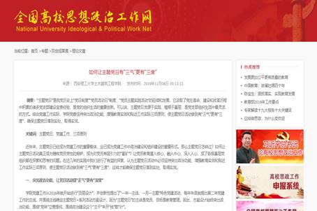 近期,由高等教育出版社主办,教育部主管,教育部思政司指导的全国高校思想政治工作网新时代全国高校党建成果专栏刊载了我院党委书记王青耀撰写的《如何让主题党日有“三气”更有“三度”》一文。文章从突出政治功能、增强教育实效和贴近工作实际三方面阐述了如何使主题党日活动做到有“三气”更有“三度”,既是我院党建工作经验性总结,也是规律性认识;既是原则方向,也是具体抓手,是我院党建工作必须长期坚持并不断深化的行动指南。